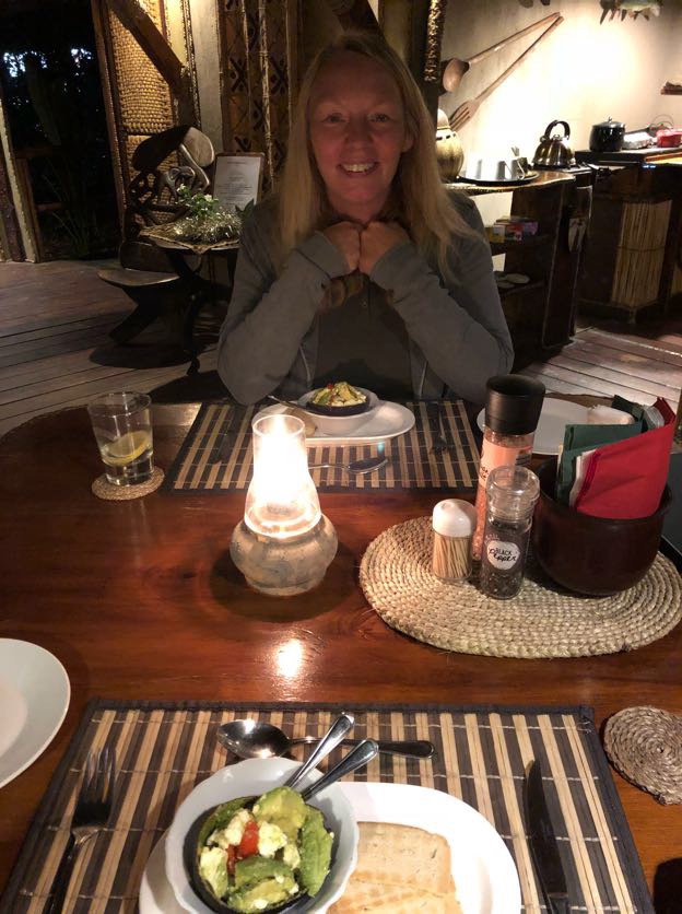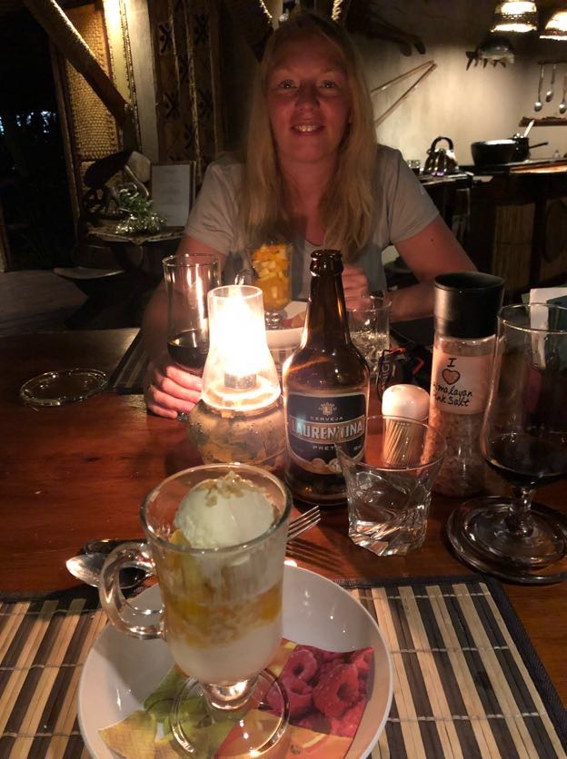 Mit dem Boot über den See zurück hätte die Fahrt gerade mal eine viertel Stunde gedauert. An was Rob sich orientieren konnte, war mir ein Rätsel, aber wir kamen tatsächlich irgendwann erschöpft und glücklich bei der Lodge an. Wir waren über 20.000 Schritte gelaufen. Vermutlich Rekord in unserer Auszeit. Nach einer Dusche spendierte uns Shinnead einen Gin Tonic und wir aßen unser Silvester-Menü. Alle waren hundemüde, so dass wir kurz nach dem Essen unsere Hüttchen aufsuchten. Ein bisschen drang das Geballer um Mitternacht aus dem nur 10 km entfernten Mosambique zu uns, aber sonst schliefen wir wie Erschlagen und bekamen nichts vom Jahreswechsel mit.