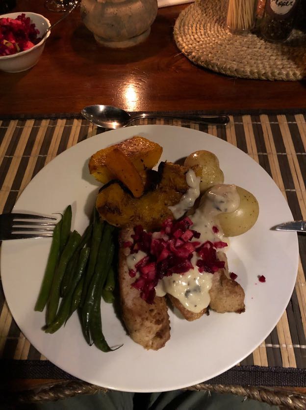 Es waren weitere Gäste angereist. Ein südafrikanisches Paar mit einem zwölfjährigen Sohn. Sie würden am nächsten Tag den Ausflug, auf den vor allem ich mich sehr freute, gemeinsam mit uns machen. Die Vorspeise wurde serviert, beim Hauptgang konnte man sich am kleinen Buffet selbst nehmen. Pam erklärte nur kurz und in ihrer angenehm witzigen Art, was es gab. Besonders das Bananen-Chutney war ein Gedicht und schmeckte köstlich zu Hähnchen und Reis. Wir gingen kurz nach der Familie direkt nach dem Essen ins Bett.