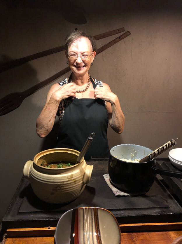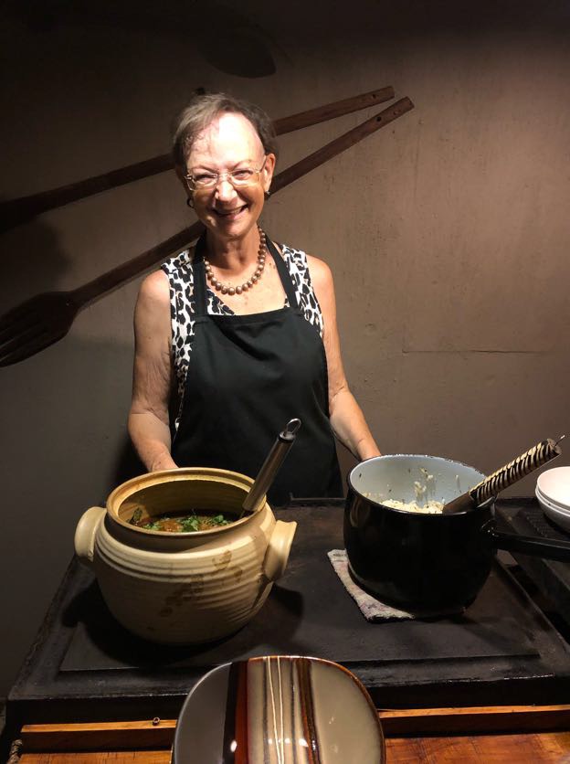 Wir verließen Bela Bela und hatten in der Nähe von Polokwane den nächsten Zwischenstopp geplant. Tom hatte in Erfahrung gebracht, dass sich die Stickerei Kaross, die sehr schöne Tischsets, Kissen und Decken herstellt, ebenfalls in der Region befand und dieser wollten wir vorher einen Besuch abstatten. Es war viel los auf den Straßen, es gab viele langsame Lkws und Baustellen und so waren wir entsprechend lange unterwegs. Die Strecke führte über Serpentinen durch bergiges Gebiet, das teilweise stark an den Schwarzwald erinnerte, weil hier so viele Nadelbäume wuchsen. Dann gab es wieder Ecken mit Bananen- und Zitrusfrucht-Plantagen. Nach 4 Stunden erreichten wir die Farm, auf der Frauen, die in der Region lebten, die mittlerweile sehr bekannten kunstbestickten Kaross-Waren herstellten. Hier gab es auch ein kleines Restaurant, das ebenfalls von den Frauen betrieben wurde. Leider war die Auswahl im kleinen Laden der Stickerinnen nicht so groß wie erhofft, aber wir fanden doch zwei kleine Mitbringsel. Anschließend gab es ein leckeres Lunch. Für gerade mal 12 Euro aßen wir unter den großen Feigenbäumen köstliches Couscous mit in Honig glaciertem Hähnchen sowie scharfes indisches Curry mit „Pompadour“, Reis und Salat und tranken hausgemachte Zitronenlimonade, Wasser und Cola.