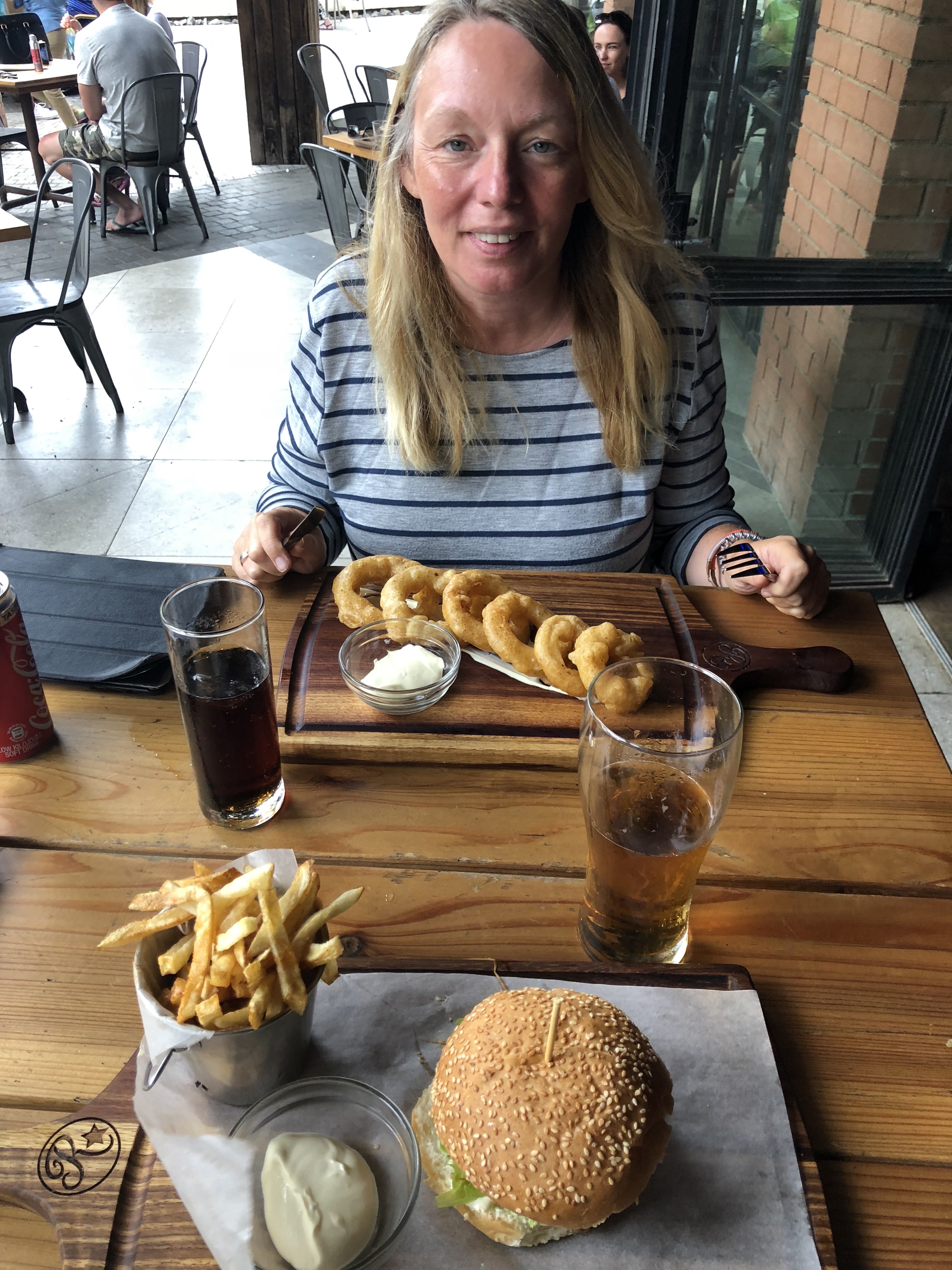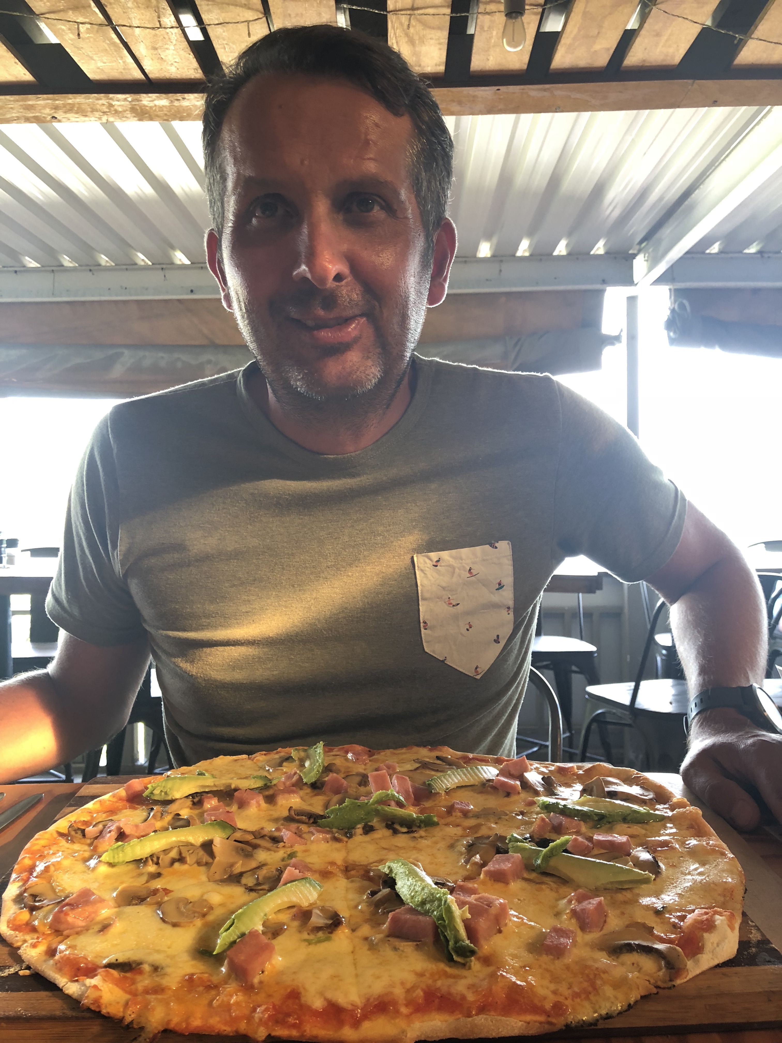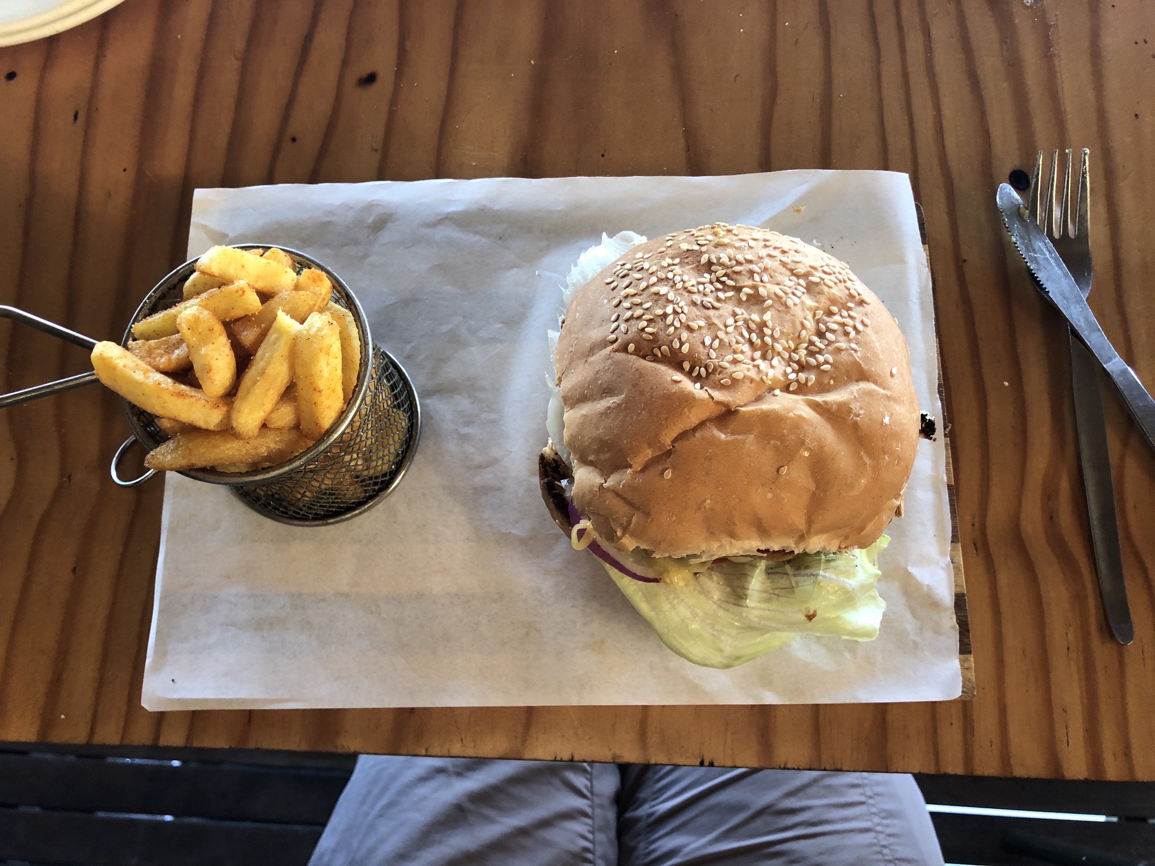 Nachdem wir uns eingerichtet hatten, hatten wir ziemlich Hunger. Da wir noch nichts frisches eingekauft hatten, beschlossen wir irgendwo in der Nähe etwas Essen zu gehen und fanden wenige Meter vom Platz entfernt eine Bar, in der Tom Pizza und ich einen Burger bekamen.