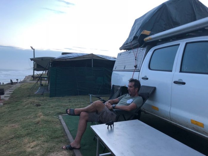 Irgendwie kommen diese Händler immer zu uns und ich fragte ihn, woran er denn erkannte, dass wir keine Südafrikaner waren. Immerhin hatten wir uns zumindest kleidertechnisch schon angepasst. Er meinte, er würde es an unseren Gesichtszügen erkennen… Es war ein interessantes Gespräch, soweit ich noch weiß. Roger, so hieß der nette Mann, war sehr interessiert an der Energiegewinnung in Deutschland, den Autos und warum jemand aus Deutschland Miroslaw Klose heißen konnte. Wir dagegen wollten uns nochmal erklären lassen, wie sich die Einheimischen in Simbabwe etwas zu essen kaufen konnten, wenn die Preise so extrem hoch waren. Er sagte uns, dass wir als Besucher oder auch ein Einheimischer auf der Bank für einen US Dollar umgerechnet 3 Zimbabwe Dollar bekommen würde. Auf dem Black Market bekommt er für einen USD 300 Zimbabwe Dollar und da wir als Touristen sowieso alles in US Dollar zahlen müssen, ist es für ihn damit immer noch sehr teuer, aber günstiger als für uns Touristen, wenn man etwas kauft. Aha… Wir wankten angeheitert zurück zum Zeltplatz. Alles war bereits klamm und salzig, durch die Scheibe unseres Autos konnte man schon nicht mehr wirklich viel sehen. Wir genossen noch ein bisschen den Meerblick und gingen schlafen.