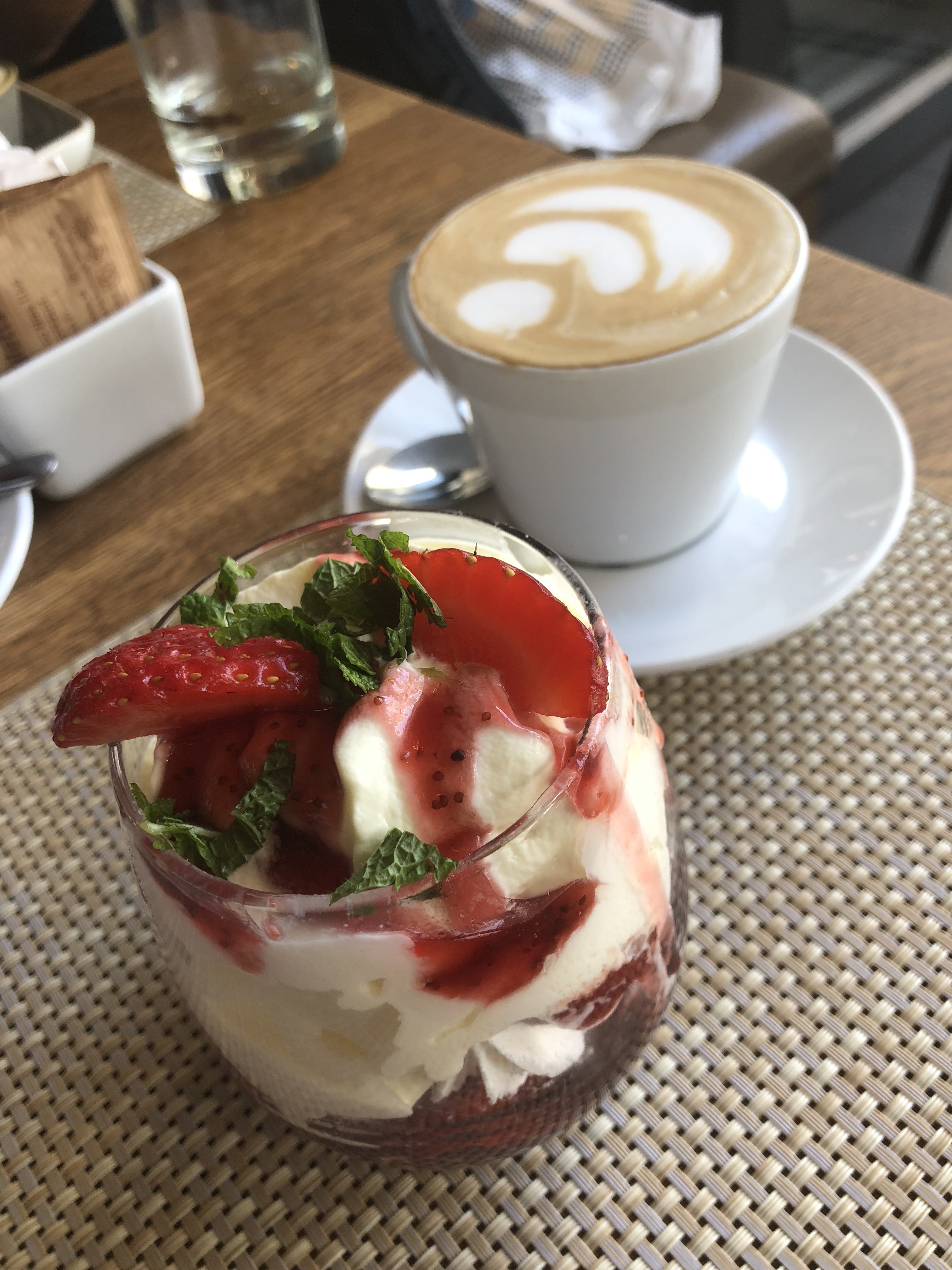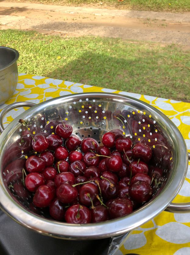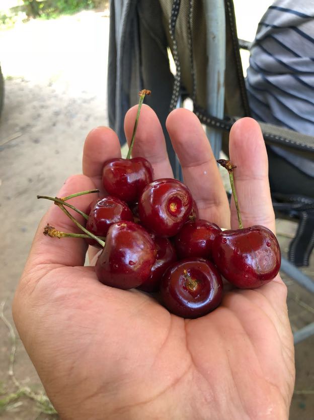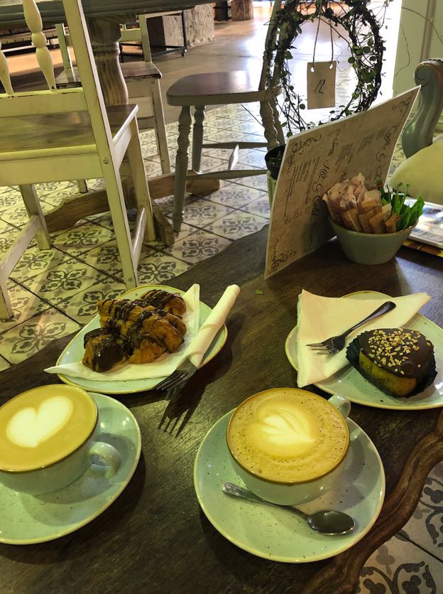 Nichts ahnend, dass es für uns eine schlaflose Nacht werden würde… es war extrem windig und die Plastikplane unseres Zelts schlug sehr laut an die Zeltwände. Tom ging nachts raus, um die Plane noch etwas besser zu befestigen, aber das nutzte auch nicht viel und so waren wir die meiste Zeit wach und lasen, in der Hoffnung, dass der Wind irgendwann nachlassen würde. Es wurde schon hell, als es besser wurde. Wir standen früh auf, packten unsere sieben Sachen und fragten bei der Rezeption, ob wir auf einen Platz weiter hinten umziehen könnten. Zum Glück wurde einiges frei und wir konnten uns einen passenden Platz aussuchen. Wir machten eine Begehung und wählten eine größere Parzelle, die etwas tiefer hinter dem Wall und einer Reihe Palmen lag. Der Platz war deutlich windgeschützter. Die aktuellen Nutzer bauten gerade ab, so dass wir noch nicht „einziehen“ konnten, aber das machte nichts. Wir mussten sowieso erst einkaufen und frühstücken. Also fuhren wir in das Einkaufszentrum, das wir schon vom letzten Mal kannten. Hier gab es mehrere Cafés. Im Vovo Telo gab es irgendein Problem, weshalb kein Frühstück serviert werden konnte. Wir tranken also nur einen Cappucino und aßen zusammen ein Stück Kuchen vom Vortag, bevor wir uns im Supermarkt mit frischen Lebensmitteln eindeckten. Es gab sogar Kirschen und Schwarzbrot!