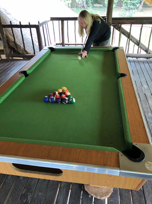 An Tag 3 war das Wetter noch nicht wesentlich besser und wir beschlossen unser Auto auszuräumen. Unser Plan war, einige Dinge, die wir gekauft hatten, wie Schlafsäcke, Thermoskanne, Thermo-Becher und anderes Geschirr, Toms Stuhl, sein Bodyboard etc. und einige andere Sachen, die wir schon mitgebracht hatten wie Fernglas, einige Kleidungsstücke und Bücher in unseren schwarzen Boxen irgendwo einzulagern, so dass wir diese bei einem späteren Urlaub wieder nutzen könnten. Tom hatte dazu einige Self Storage Firmen angeschrieben und schließlich eine gefunden, die ein Schließfach anbieten kann, das wir wahrscheinlich und für kleines Geld anmieten können. Wir wollen dort am 11.1. vorbeischauen, wenn wir wieder in Johannesburg sind. Allerdings wollen die so einige Unterlagen, die wir nicht in Südafrika dabei haben. Müssen wir also auf uns zukommen lassen, ob wir trotzdem mieten können. Wir packten alles aus und sortierten unsere Sachen in zwei entsprechende Stapel: hierbleiben und mitnehmen. Positiver Nebeneffekt. unser Gepäck reduziert sich auch ein bisschen. Nachmittags spazierten wir ein bisschen über das Gelände und spielten eine Runde Pool Billard, bevor wir unser einziges Fertigessen in diesem Urlaub zubereiteten. Ein indisches Curry, das gar nicht so schlecht war.
