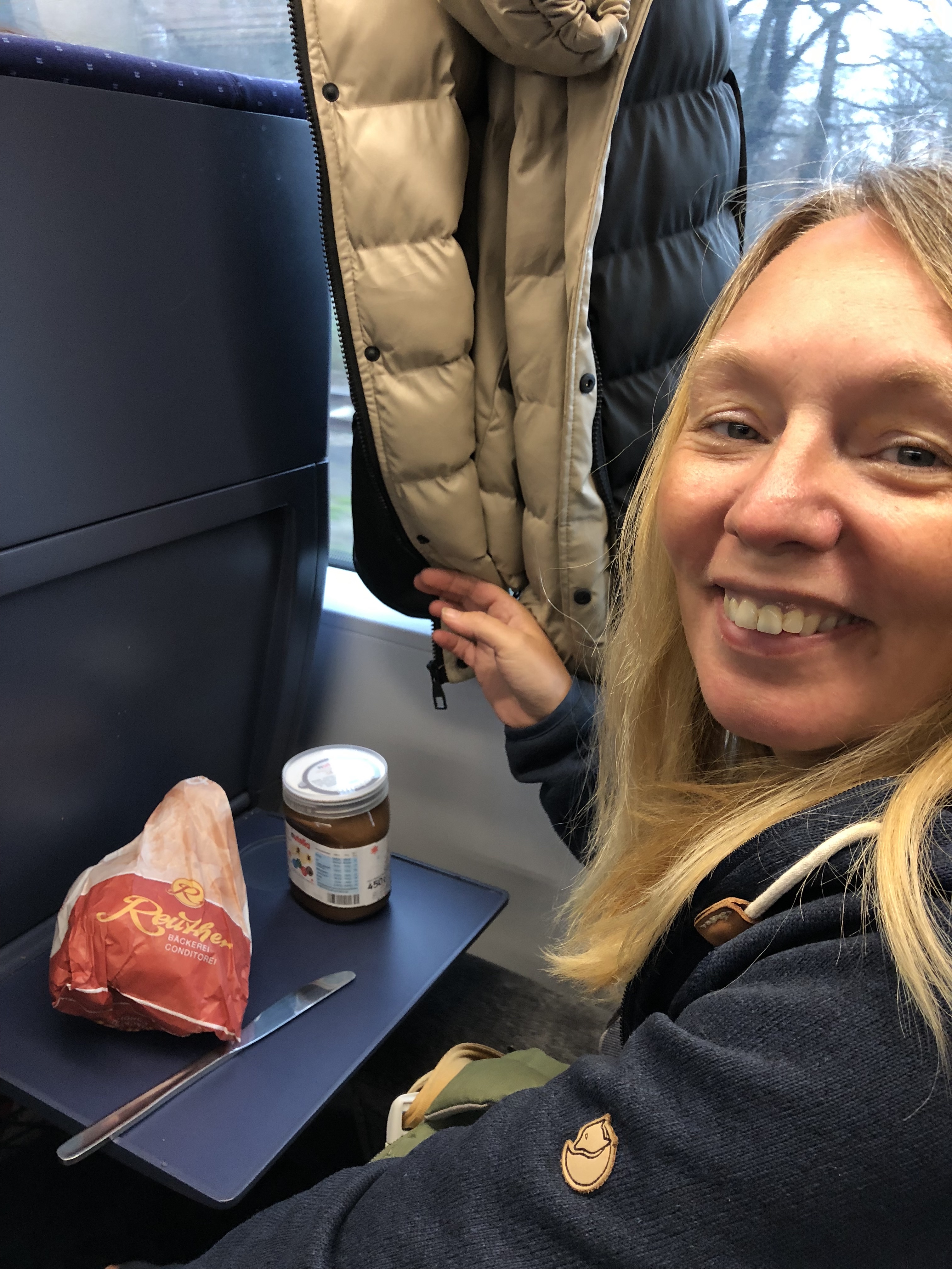 Sie wartete mit uns auf unsere Bahn, wo wir, als wir erst mal das Gepäck verstaut hatten, Nutella-Brötchen aßen. Köstlich!