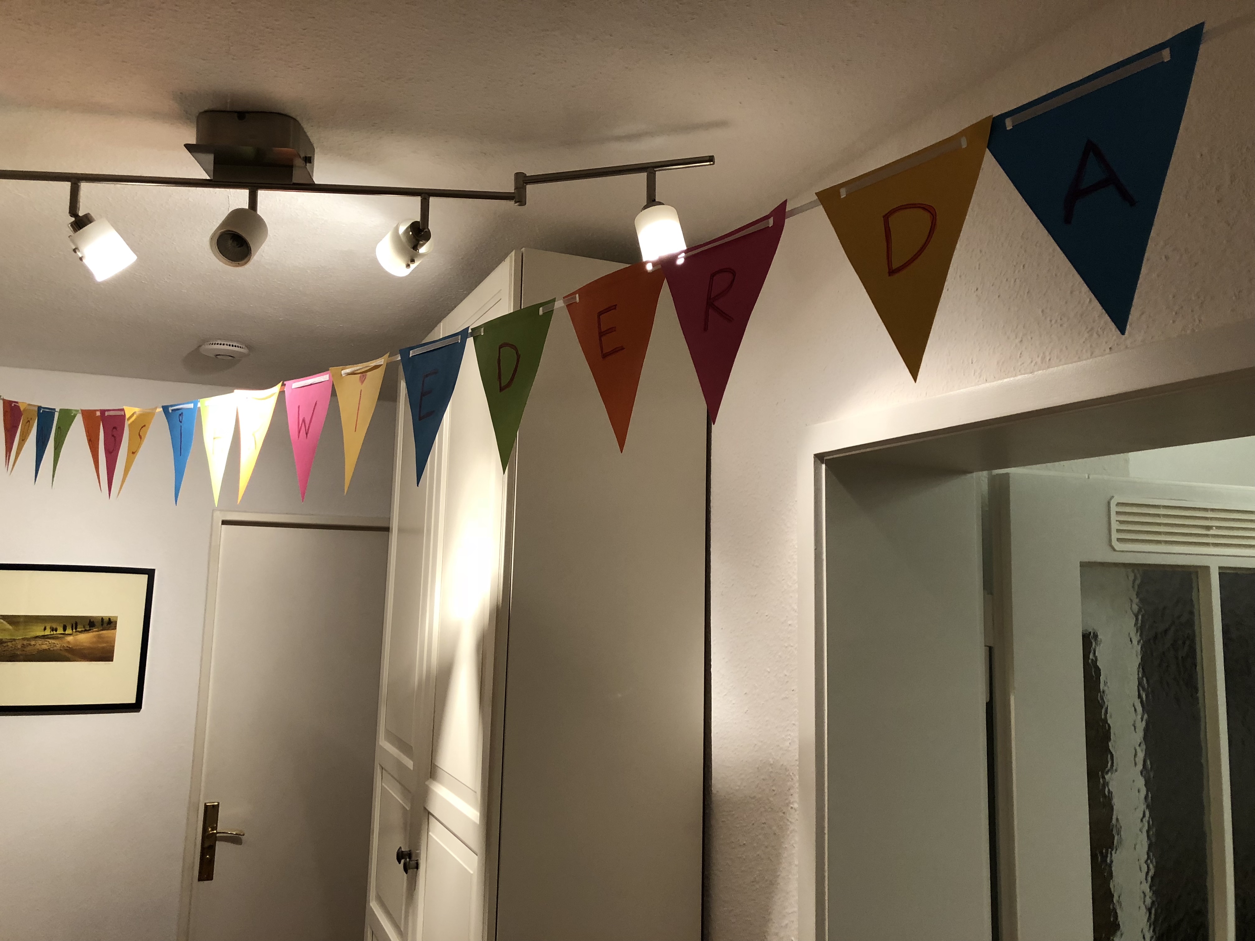 Wir waren ziemlich fertig und hofften nur, dass wir zuhause im Keller gleich unsere Kissen und Bettwäsche finden würden, die wir dort vor unserer Abreise irgendwo eingelagert hatten. Zuhause erwartete uns dann noch eine Willkommensbanderole mit Begrüßungsbrief von meiner lieben Mama, was uns auch total gefreut hat! Netterweise hat sie auch ein paar Grundnahrungsmittel und sogar Weihnachtsplätzchen für uns da gelassen! Es tut gut, dass wir auch vermisst wurden…
